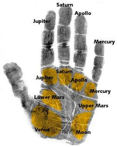 Hand analysis – Mounts of Various planets viz Sun, Moon, Mars Mercury, Jupiter, Saturn and Venus. Effects of these mounts on human and predictions based on this mounts.
